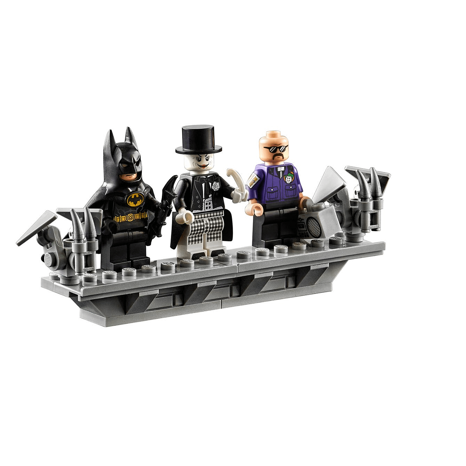 - De onmiskenbare stijl van de Batwing uit de film BATMAN™ (1989) komt prachtig tot uiting met een stevige standaard, een naamplaatje en 3 minifiguren: BATMAN, THE JOKER™ en een Gettoblasterschurk.